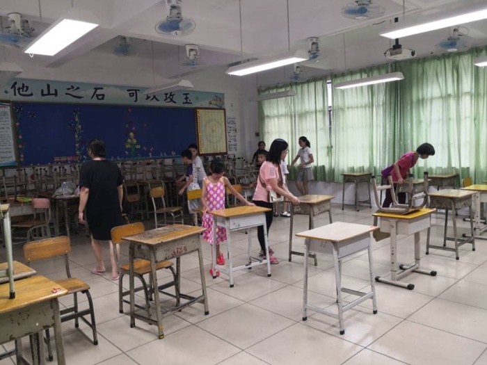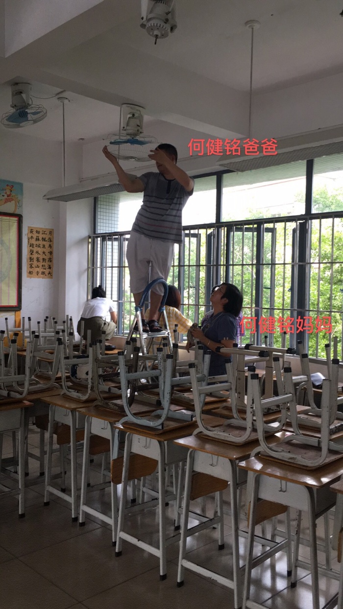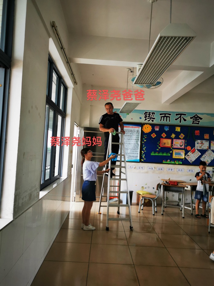瞧!家長(zhǎng)們把所有的電風(fēng)扇、桌椅、地板、黑板、門(mén)窗、窗簾擦洗得干干凈凈!每一次擦拭都帶著溫柔的目光,那是因?yàn)閷?duì)孩子們的愛(ài)!因?yàn)閻?ài)所以用心!