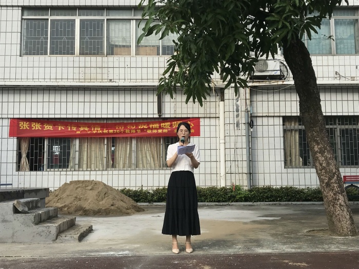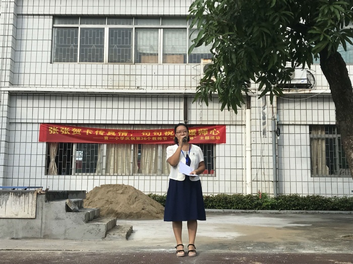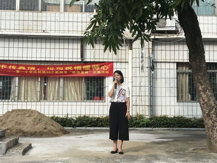 升旗儀式上,陳柯儀老師進行了《感恩教師》的國旗下講話,用深情的語言贊美了教師的崇高品格,令在場師生十分動容。“感恩老師,并不需要我們?nèi)プ鲶@天動地的大事,它表現(xiàn)在日常生活中的點點滴滴”說出了在場所有老師的心聲,同時也教育了學生怎樣去“敬師愛師”。接著,蔡藝紅主任代表學校向全體老師致以節(jié)日的問候與誠摯祝福,勉勵全體曹一學子要繼續(xù)傳承和發(fā)揚中華民族尊師重教優(yōu)良傳統(tǒng),銘記教誨,不忘師恩,潤物無聲,報之以聲。并發(fā)動同學們用賀卡的的形式來表達對老師的敬愛之情。