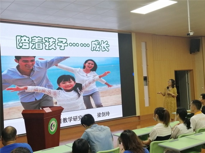 伴隨著掌聲,中山市教體局教研室心理健康教育教研員梁劍玲老師進行了主題為“陪著孩子慢慢成長”的講座,梁老師根據(jù)一年級學生的心理特點,指出學生的心理水平還停留在不隨意性和具體形象階段,當學生逐漸意識到“自己是一名小學生”時,他的行為也會發(fā)生一些自覺性,讓他幫忙做一些事會很積極地響應,表明孩子開始明白一些社會責任了。對于一年級學生,心理健康教育的目標是:適應新的環(huán)境,新的學習生活,樂與老師同學交往,初步建立人際關系;認識角色任務,培養(yǎng)積極樂觀的學習情趣,建立良好的行為習慣。同時,梁老師還指出,在一年級孩子的成長過程中,家長們不能操之過急,要靜待花開,飽以滿分的期待對待成長中的孩子。