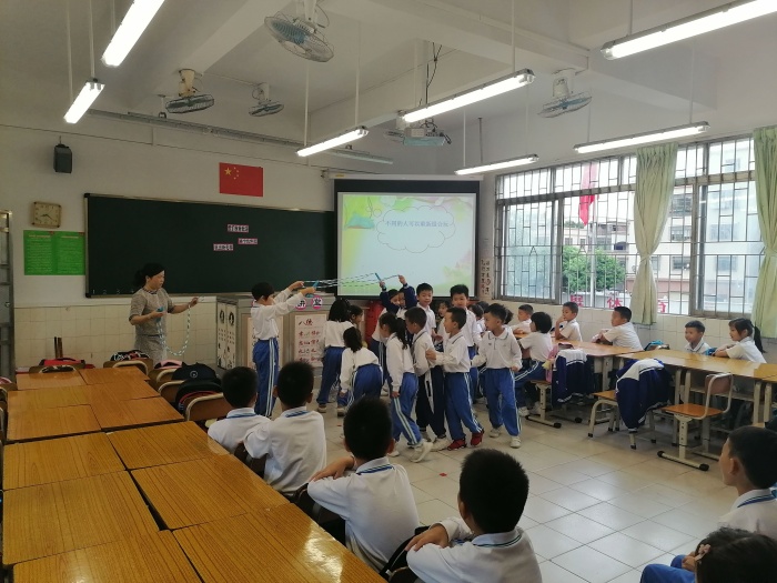 本次研討活動以李潔英老師執(zhí)教的二年級課例《我們的新玩法》展開。在課堂中,李老師課通過探究“玩出新花樣”、“不同的玩具也可以組合起來玩”這兩大環(huán)節(jié),先以小精靈邀請同學們參加游戲王國的游戲節(jié),激發(fā)學生的學習的熱情高漲。出示小精靈帶來跳繩的新玩法,讓學生觀察,探索這些跳繩有哪些新花樣,怎樣玩。學生通過玩繩子游戲,感受跳繩新花樣帶來的樂趣。