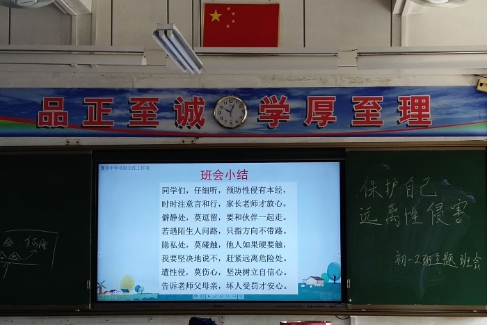 為了防止惡性事件的發(fā)生,教育學生保護自己,2020年10月12日上午第二節(jié)曹步中學初一(2)班進行了以“保護自己,遠離性侵害”為主題的班會課,初一(2)班班主任李佳寧老師及全班39名學生參與了這次班會課。