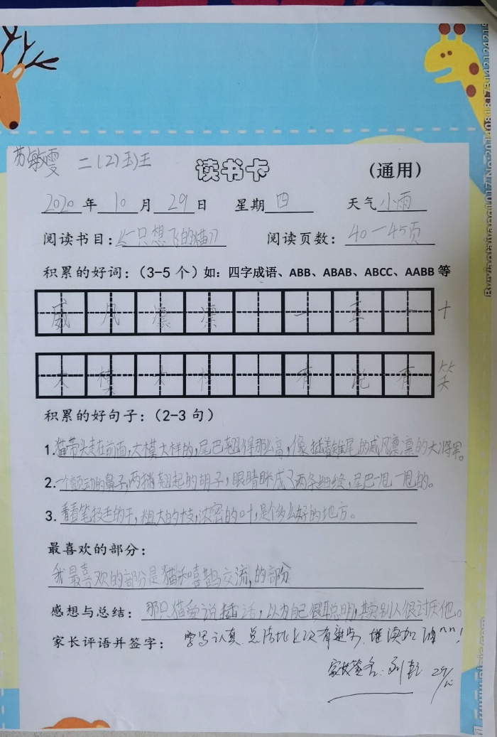 一直以來,二2班的語文老師曾文媛非常重視培養(yǎng)孩子們的閱讀習慣,曾老師結(jié)合書本的“快樂讀書吧”給學生推薦了《一只想飛的貓》一書,以此激發(fā)孩子們的讀書欲望,從而慢慢培養(yǎng)他們的閱讀習慣。
