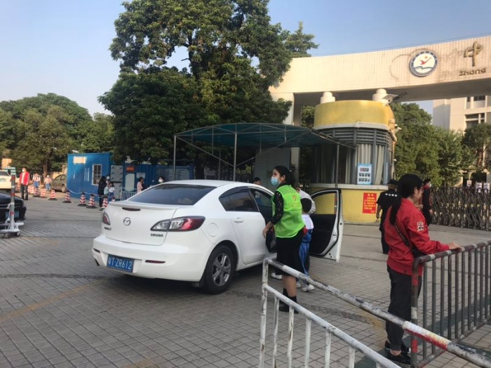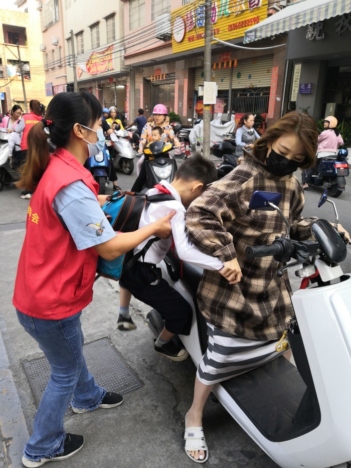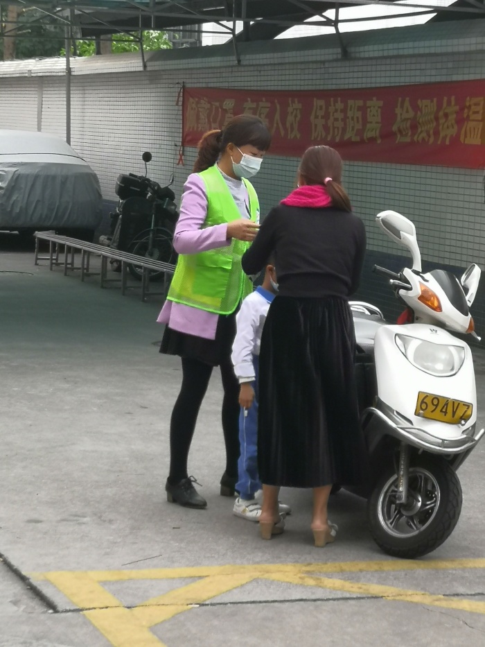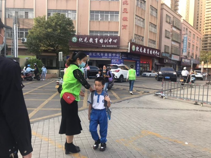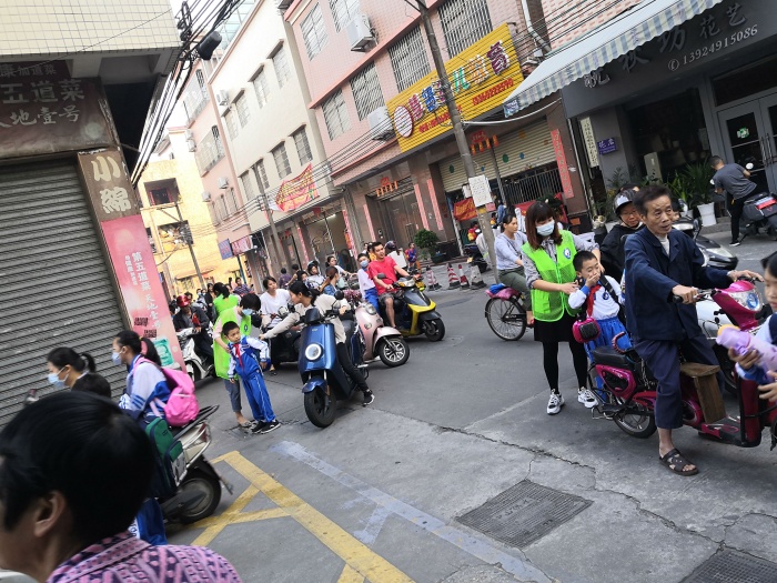 7:40——7:50分是學(xué)生流量最大的時(shí)候,摩托車、小汽車接踵而來,也是交通最堵塞的時(shí)候。為了能更快地疏導(dǎo)交通,義工隊(duì)的家長(zhǎng)們有條不紊地忙碌著:他們從摩托車上扶下個(gè)子小的孩子,幫助他們背上沉重的書包;教育孩子跟爸爸媽媽說一聲再見;拉一下車門,讓孩子快速的從車上下來,輕輕一關(guān)車門,車即離開......