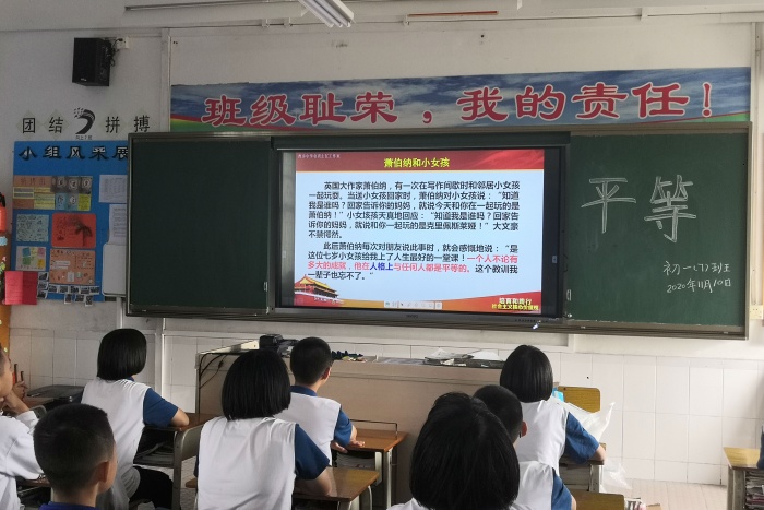 第四部分:說踐行。朱嘉琪老師讓同學(xué)們針對自己身邊(不)平等的事情說出自己的感受和看法。最后,朱嘉琪老師告訴同學(xué)們:人生而平等,大家都在初一(7)班的教室里學(xué)習(xí),每個人都是平等的,要互相理解、互相包容,然后共同進步,真正的成為相親相愛的一家人。