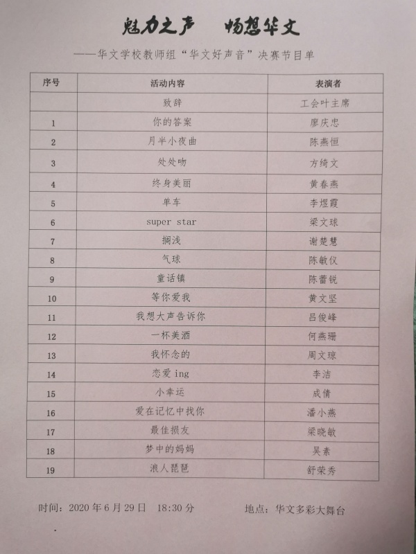 為進(jìn)一步豐富校園文化生活,努力營(yíng)造積極向上、百花齊放、格調(diào)高雅、健康文明的校園文化氛圍,豐富校園師生的業(yè)余文化生活,加強(qiáng)校園精神文明建設(shè),展示華文學(xué)校團(tuán)結(jié)創(chuàng)新、銳意進(jìn)取、蓬勃向上的精神風(fēng)貌,由學(xué)校工會(huì)決定舉辦教師組“華文好聲音”歌唱大賽。