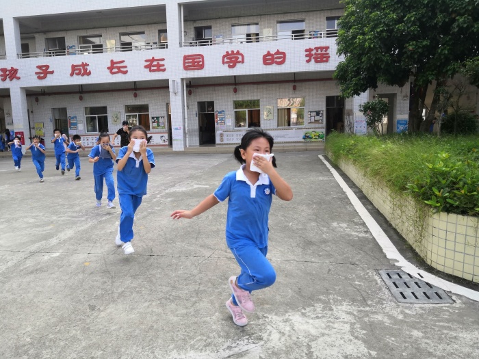 上午8時(shí)40分,“嗚嗚嗚……”一陣陣急促的警報(bào)聲在校園內(nèi)響起。各班課室里正在上課的師生們立刻停下了教學(xué)和學(xué)習(xí)活動,在上課老師的組織下有序地從各班課室里疏散出來,沿著平時(shí)指定的路線奔向田徑場。警報(bào)聲響起時(shí),在思齊樓前樓三樓最西邊的三4班正在上語文課。聽到警報(bào)聲,學(xué)生們立刻在老師的指揮下,跑出課室,沿著走廊向東跑,到了三8班課室后門,再向北拐穿過連廊。連廊的盡頭是機(jī)房。同學(xué)們在機(jī)房前再沿走廊向東拐,下樓梯,繞過一樓花圃,按照指定的路線繼續(xù)向田徑場跑去……