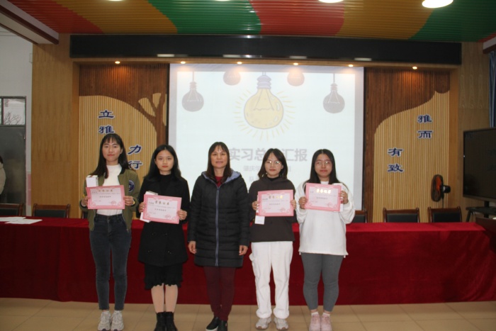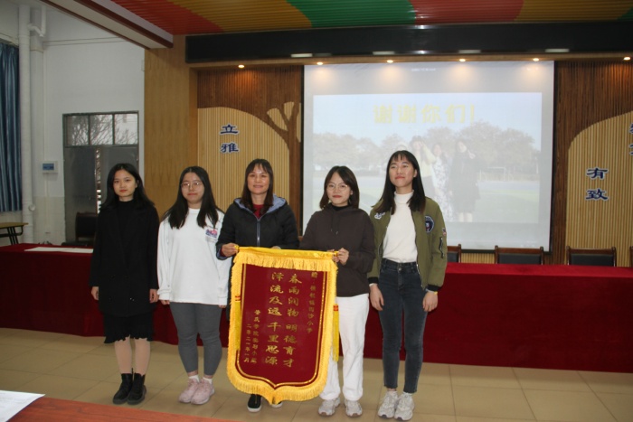 在熱烈的掌聲中,實習小組向四沙小學贈送了上書“春雨潤物明德育才 澤流及遠千里思源”錦旗。四沙小學歐慧芳校長也代表學校向她們頒發(fā)了“優(yōu)秀頂崗老師”榮譽證書,表達了學校對她們幾個月來為四沙小學所作貢獻的充分肯定,并祝愿她們能把在四沙小學的學習工作經歷當作人生旅途中的一筆財富,為日后早日踏上教書育人講壇、成為一名光榮的人民教師做準備。
