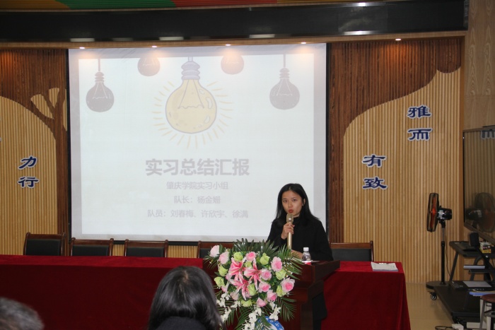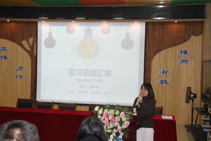 歡送會上,隊長楊金珊老師代表實習小組作了實習總結發(fā)言。以時間為順序,她展示了大家在四沙小學所經歷過的“第一次”,展現(xiàn)了她們第一次以教師身份過教師節(jié),第一次獨立上課,第一次家訪,第一次參加教研活動……每一個第一次,都記錄著學校行政教師對他們的關心和幫助,都記錄著她們自身的努力和進步。她們深深感謝四沙小學這塊沃土、溫暖的大家庭,給了她們成長的機會,給了她們發(fā)展的平臺,使她們得到了鍛煉和成長。緊接著,其他隊員許欣宇、劉春梅和徐滿老師也先后從自身的感受出發(fā),分享了她們在四沙小學短短的幾個月來學習、工作和生活的點點滴滴,再現(xiàn)了她們成長的心路歷程,表達了她們對四沙小學和全體師生們的感激之情。
