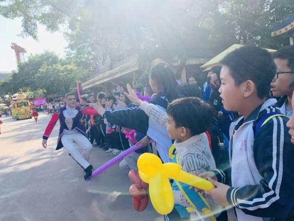 中午11時,同學(xué)們到達(dá)研學(xué)的第二站——廣州長隆歡樂世界,這也是孩子們最為期待的一站。廣州長隆歡樂世界是目前國內(nèi)在設(shè)備上最為齊全的大型游樂園,擁有游樂設(shè)施70余套,是深受小朋友們喜愛的兒童王國。孩子們在導(dǎo)游老師的帶領(lǐng)下興高采烈地玩起來了:有的同學(xué)在玩全球獨一無二的虛擬實景星際探險旅程——“星際決戰(zhàn)”;有的同學(xué)則相約在“森林神廟”,在樹魔、火龍帶領(lǐng)下領(lǐng)略傳奇故事;有的同學(xué)和老師一起挑戰(zhàn)刺激有趣的飛馬家庭過山車,大家喜氣洋洋,歡笑聲、尖叫聲一片!可真是不亦樂乎!大家開開心心地玩,人人臉上喜笑顏開,現(xiàn)場真正成為了“歡樂世界”!可快樂的時光總是過得那么快,下午4時,研學(xué)活動結(jié)束,同學(xué)們依依不舍,盡興而歸。