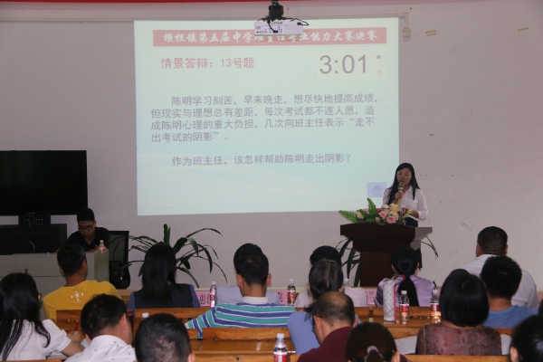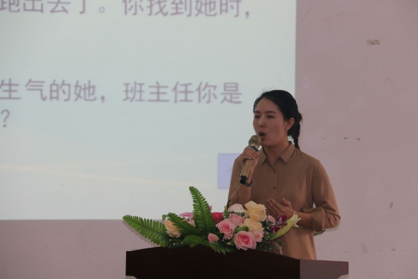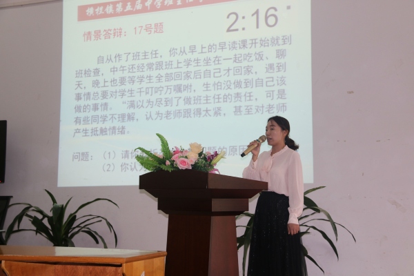 在第一環(huán)節(jié)的情景答辯中,選手們結(jié)合現(xiàn)場抽到的教育情景和自己的教育理念分享作為班主任的看法及處理方式。參賽的班主任在舞臺上侃侃而談,自信而淡定的專業(yè)素養(yǎng)漸漸展現(xiàn)出來。其中,劉冰倩老師結(jié)合自己帶班兩年來班級突出的“早戀”問題所積累的教育經(jīng)驗進行分享,她強調(diào),解決初中生早戀問題切不可強硬,而應(yīng)該以走進學(xué)生心里的方式引導(dǎo)學(xué)生學(xué)會自我思考,自我教育,并做出正確的選擇。