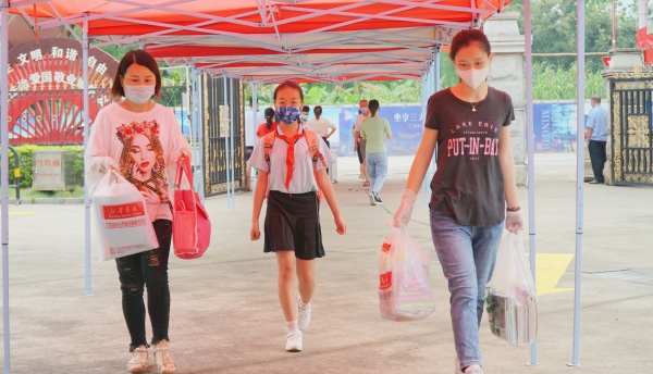 第一天的工作顯得尤其重要,所有班主任早早進入教室,迎接久別的孩子。雖然是錯峰返校,人員不密集,但是大家對安全一刻沒有放松。為了減少學生與外來人員接觸的機會,按照上級統(tǒng)一部署要求,首先要把好進校門第一關。相關老師和工作人員都按照規(guī)定提前到崗,履行職責。學生抵達學校后,除學生本人可以進入校園外,學生家長、其他同行人員、車輛均不得進入校園。所有沒有課的老師配合保安人員維持現(xiàn)場秩序,確保每個學生間隔一米排隊等候。學生出示健康碼,佩戴好口罩才能進入校園,保安人員對學生進行了嚴格的體溫檢測,噴灑免洗洗手液,嚴格把好進門關。學生中有帶行李和文具的,將行李和文具放置在設定的消毒區(qū)域,由工作人員對其進行消殺后,學生方可攜帶行李進入校園。默契的配合,一切都顯得那么自然而溫馨,疫情無情,校園有愛……