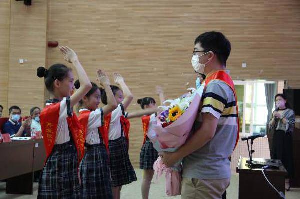 活動由德育與個性發(fā)展室主任汪湄主持,五位“抗疫先鋒”分別為開發(fā)區(qū)公安局民警鄧舜、開發(fā)區(qū)醫(yī)院醫(yī)生劉錦明、美味鮮食品有限公司后勤部負責人楊巧萍、開發(fā)區(qū)疾控中心工作人員黃俊陽和開發(fā)區(qū)文體宣傳中心工作人員吳飛飛。在主持人進行簡單介紹后,少先隊員代表為他們獻花和綬帶。隨后,鄧舜同志首先分享如何帶領無人機作戰(zhàn)小組開展疫情宣傳及防控工作。劉錦明同志以“2020年,我的戰(zhàn)‘疫’日記”為主題,分享作為中山市新冠肺炎重癥治療專家組成員面對病人如何與病毒較量,為生命站崗。楊巧萍同志的先進事跡為主動請纓投入一線戰(zhàn)疫確保了集體和廣大群眾的民生保障。曹俊陽同志帶領同事們做好各項疫情防控工作,為市民群眾提供精準的科學就醫(yī)和防護指導。吳飛飛同志分享了自己在武漢作為社區(qū)抗疫志愿者的日常工作。“抗疫先鋒”的先進事跡,彰顯了疫情背景下為國為民主動擔當?shù)母呱星閼选;顒幼詈?,“抗疫先鋒”與師生合影留念。