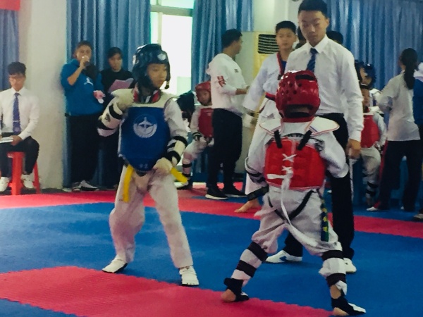 開賽后,運動員們?nèi)砼状┐骱米o具,精神抖擻地走上賽場,裁判員一聲令下,雙方互相用腳奮力攻擊、閃躲、反擊,運動員們反應迅速、動作敏捷。而在品勢賽上,運動員一招一式勁道有力,幼兒組賽的小朋友們表現(xiàn)得也是有模有樣。場上,隊員們激烈拼搏。場下,觀眾們也不示弱紛紛為隊員們吶喊助威,吶喊聲震耳欲聾,歡呼聲此起彼伏……。