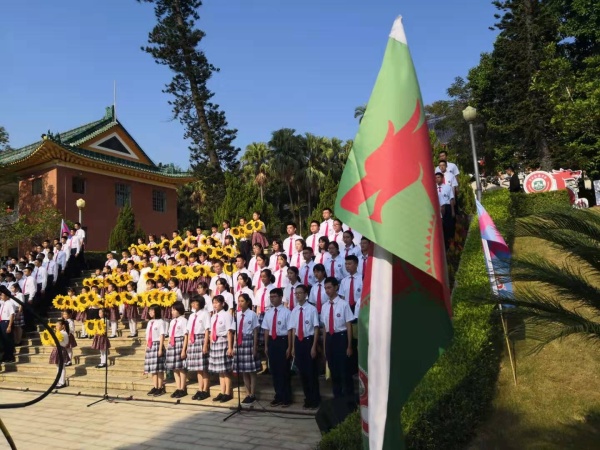 當(dāng)天晴空萬(wàn)里,空氣清新。石岐第一小學(xué)的陽(yáng)光天使合唱團(tuán)40名小演員們?cè)诙跗G霞校長(zhǎng)的帶領(lǐng)下,穿著整齊的校服,戴著鮮艷的紅領(lǐng)巾,早早就來(lái)到了紀(jì)念中學(xué)的校園里等候活動(dòng)的開(kāi)始。上午九點(diǎn),在紀(jì)念中學(xué)的民國(guó)建筑群漢白玉雕像前,一臺(tái)精彩的文藝表演拉開(kāi)了校慶活動(dòng)的序幕。石岐第一小學(xué)的陽(yáng)光天使合唱團(tuán)和紀(jì)中合唱團(tuán)的大哥哥、大姐姐一起唱起了由著名作曲家李海鷹寫的《我們的孫中山》,美妙的歌聲在紀(jì)念中學(xué)的上空飄響:五桂山下,蘭溪河畔,原野飄香宛如天堂,翠亨村曉醒來(lái)的阡陌上,走過(guò)來(lái)一個(gè)人——我們的孫中山。走過(guò)多少路,名字叫中山,條條中山路都通往四方,飛越大海聯(lián)結(jié)中國(guó)心,世界的孫中山,我們的孫中山。
