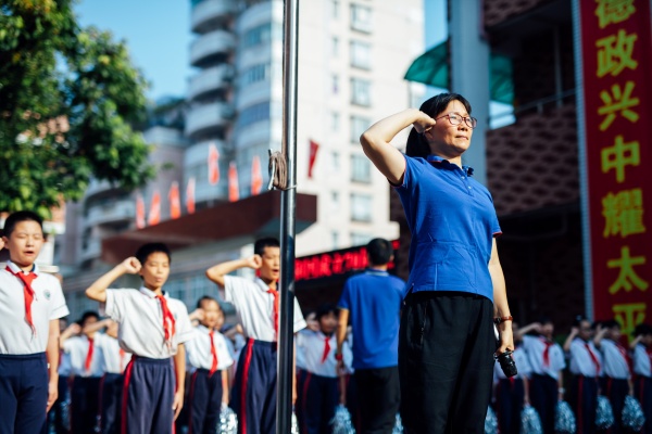 雄壯的愛國歌曲剛結束,低、中、高三個年段的愛國詩詞集體朗誦便一波接一波的涌來,太平小腳丫的赤子愛國之情在澎湃的朗誦聲中表達的淋漓盡致。緊接著就是莊嚴的升旗儀式,四位佩戴著鮮艷紅領巾的升旗手在莊嚴的國歌聲中將五星紅旗徐徐升起,全體教師行注目禮,少先隊員行隊禮,在金秋朝陽的照耀下,五星紅旗顯得更加的驕艷、溫暖與厚重。
