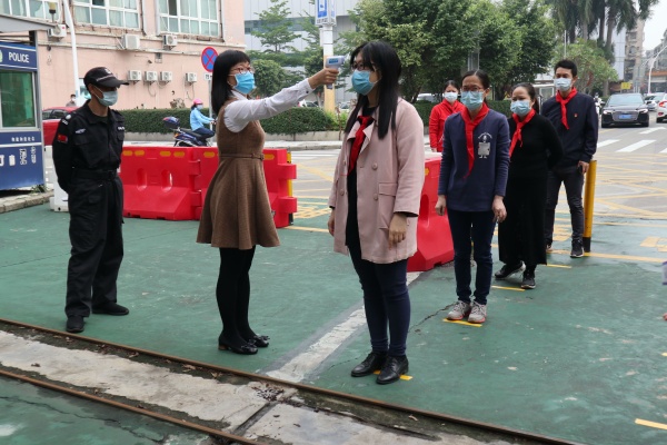 要求學(xué)生排隊入校園,互相間隔1米,進入校門兩位老師在校門口內(nèi)負責(zé)測量體溫,兩位老師隨機詢問學(xué)生。(若發(fā)現(xiàn)有體溫高于37.3°C,立刻由值班老師帶至隔離觀察區(qū),經(jīng)專門通道至師生發(fā)熱臨時隔離觀察室,第一時間聯(lián)系家長,同時詢問是否有疫區(qū)旅居史,如果有第一時間和疾控中心部門聯(lián)系,同時上報教體局。)體溫正常,無感冒、咳嗽癥狀學(xué)生按既定路線依次進入校園。