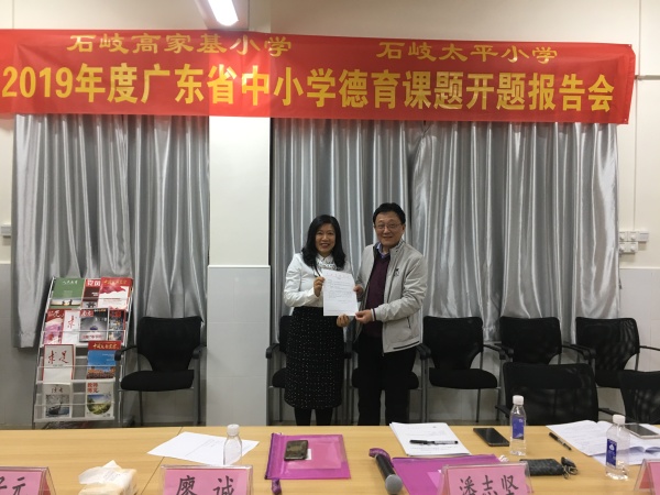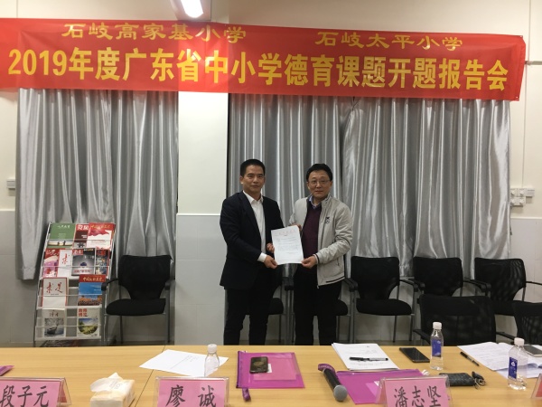 12月6日下午,石岐太平小學和高家基小學聯(lián)合在高家基小學煙墩校區(qū)一號樓三樓黨員活動室舉行了2019年度廣東省中小學德育課題開題報告會。出席報告會的有中山市教育工委副書記廖誠,市中小學德育中心副主任、石岐區(qū)教育事務指導中心德育專干潘志堅,三角鎮(zhèn)蟠龍小學段子元校長,廣東省名班主任工作室主持人黃文繼老師,石岐太平小學鄭結(jié)霞校長引領(lǐng)的太平小學課題組成員,石岐高家基小學黃榮勝校長引領(lǐng)的高家基小學課題組成員以及石岐實驗小學馮漢文校長。