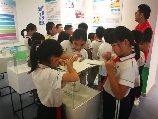 走進心知灣禁毒社工服務中心,禁毒辦工作人員首先對石岐區(qū)康復工作站的工作內(nèi)容、開展的相關活動,及工作站“七類四級”管控模式進行了簡單的介紹。接著,又帶著大家參觀了康復工作站的書畫室。書畫室中,有書畫老師、戒毒者,以及慕名前來學習的小朋友們的精美作品;看到這些書畫,家長和師生們紛紛贊嘆,真沒想到在康復工作站居然還有如此高尚雅致之地!緊接著,禁毒辦工作人員又帶領大家參觀了中山市石岐區(qū)毒品教育基地。在教育基地中,禁毒辦工作人員對新型毒品種類、特點、危害進行了詳細的講解,同學們邊聽邊認真地做著筆記。同學們通過對毒品的近距離觀察,不時發(fā)出一聲聲驚嘆。當大家走進中山禁毒時光屋,看到各種自己愛吃的跳跳糖、棒棒糖、咖啡等成了毒品,一個個都很吃驚,表示以后不敢再吃這些東西了。禁毒專干告訴他們,這些并不是他們愛吃的東西,而是不法分子把新型毒品進行改裝,引誘他們吸毒,所以以后要加強警惕,陌生人給的食物不要隨便接受,以免上當。