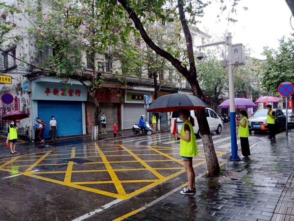 強對流天氣帶來短暫性暴雨,學校護衛(wèi)隊堅守崗位,開始第一天的護校工作。為了保障順利開學,早上6:50他們就早早來到高家基巷口,換好值日服裝,戴上防護手套,開始晨間工作。他們兵分多路,有的在路口疏導(dǎo)交通,有的引導(dǎo)家長有序停車,還有的護送學生過馬路。他們?nèi)藬?shù)不多,但是分工明確:一部分是負責協(xié)助路邊下車的學生,攔停機動車道車輛,以確保自身安全及學生能安全通行;另一部分是負責開關(guān)私家車車門,接送學生,以免造成道路擁堵。并且,由于在疫情期間,護衛(wèi)隊隊長特別強調(diào):“所有隊員在值崗過程中不能觸碰學生及學生物品,人與人間保持至少1米以上安全距離,戴一次性手套。”這一個個細節(jié)展示了學校護衛(wèi)隊工作的細致、認真和用心。