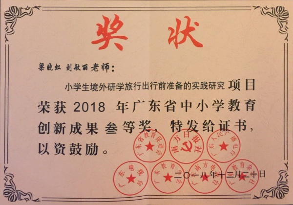 12月29日,天氣雖然寒冷,但擋不住科研的熱情。2018年度廣東省中小學(xué)教育創(chuàng)新成果獎頒獎大會在廣州市越秀區(qū)越秀賓館舉行。本屆創(chuàng)新獎評審全省共有679項成果參評,經(jīng)過評審,共評出186項獲獎成果,一等獎3項、二等獎46項、三等獎137項。中山市石岐楊仙逸小學(xué)梁曉虹副校長和劉敏麗老師主持的《小學(xué)生境外研學(xué)旅行出行前準(zhǔn)備的實(shí)踐研究》喜獲三等獎,梁曉虹副校長參加了此次頒獎大會。