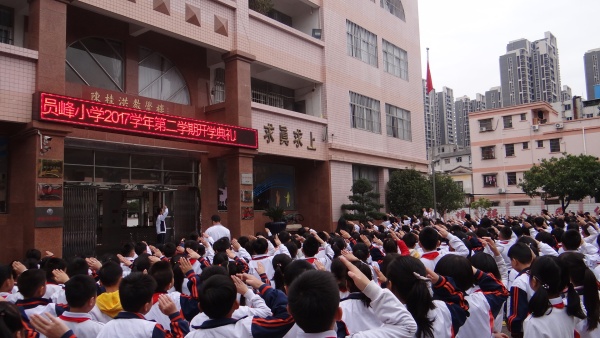 今天陽光燦爛,操場上麻楝樹長出嫩綠的枝丫。石岐區(qū)員峰小學的師生們在校園的操場上舉行了開學典禮!