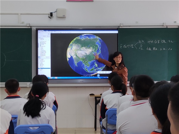 說課活動之后,北區(qū)中學(xué)勾青梅老師在智慧課室給初二學(xué)生上了一節(jié)《中國的區(qū)域差異——人文差異》的公開示范課。勾青梅老師作為市級地理課題《Google earth在初中地理教學(xué)中的應(yīng)用》的成員,在示范課例中大量應(yīng)用Google earth 軟件,繪制多邊形展示了四大區(qū)域輪廓,發(fā)揮了Google earth的地理模型功能,利用縮小和放大功能展示了青藏地區(qū)的河谷農(nóng)業(yè),大大激起了學(xué)生的學(xué)習(xí)興趣,利用Google earth的地形圖展示功能,為學(xué)生展示了立體的地圖,利于學(xué)生的立體思維學(xué)習(xí)與發(fā)展,并在最后利用Google earth瀏覽功能展示了世界六大灣區(qū)在地球上的位置與形象,起到了非常好的教學(xué)效果,受到聽課老師的一致好評。整節(jié)課,重難點(diǎn)突出,應(yīng)用了大量的智慧課堂技術(shù),將地理學(xué)習(xí)上升到一個新的高度。