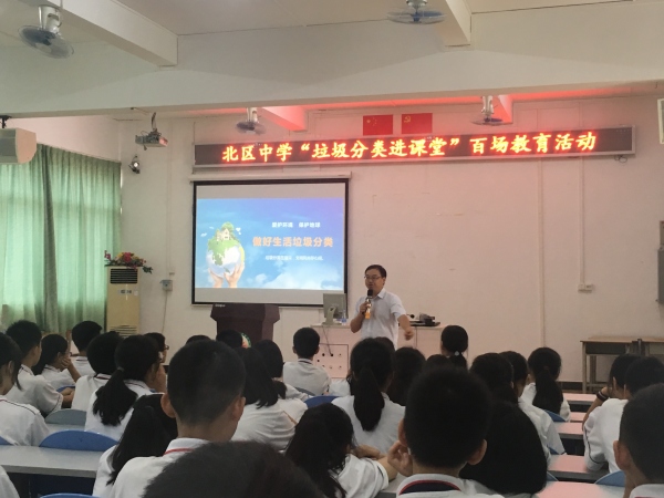 為了提高中學(xué)生生活垃圾分類和環(huán)境保護意識,倡導(dǎo)“垃圾分類,從小做起”的教育理念,5月29日下午,中山市城市生活垃圾分類收集實施小組來到了中山市北區(qū)中學(xué),在完美報告廳里,電子科技大學(xué)中山學(xué)院張景強老師做了“愛護環(huán)境,保護地球”生活垃圾分類的講座,北區(qū)中學(xué)初一級的全體師生參加了這次活動。