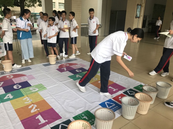 “實踐是檢驗真理的唯一標準”,為了讓學(xué)生真正的參與到實踐中來,學(xué)生們在空架層進行了“垃圾分類進課堂”游園活動,活動現(xiàn)場設(shè)置了如“垃圾分類投放模擬游戲”、“投籃”、“拼圖”、“跳飛機”和“抓沙包”等系列垃圾分類主題游戲攤位,供學(xué)生們體驗游玩。學(xué)生積極參與,并樂在其中,通過游戲的方式,加深學(xué)生對垃圾分類的認識。