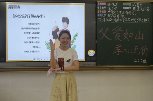 6月19日 上午,各班舉行“父愛如山 孝心無(wú)價(jià)”主題班會(huì),讓同學(xué)們了解父親節(jié)的由來(lái),交流父愛在日常生活中的體現(xiàn)。一組組溫馨的圖片、歌曲、短片讓同學(xué)們回憶起和爸爸在一起的美好時(shí)光。一首歌,一支曲,都是我愛您!課堂上,他們大聲唱響《父親》這首屬于爸爸的歌,還為爸爸們帶來(lái)了《爸爸最好了》的手語(yǔ)操表演。