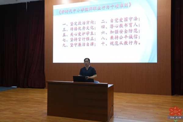 拜師活動(dòng)結(jié)束后,石岐中心小學(xué)梁麗文副校長(zhǎng)(主持全面工作)為大信學(xué)校全體老師做師德建設(shè)主題教育的專題講座。梁校長(zhǎng)用鏗鏘有力的聲音為大家傳遞并解讀《新時(shí)代中小學(xué)教師職業(yè)行為十項(xiàng)準(zhǔn)則》。強(qiáng)調(diào)作為教師我們應(yīng)該時(shí)刻自重、自省、自律、自警、自覺(jué)要求自己,執(zhí)著于教書(shū)育人,自覺(jué)維護(hù)人民教師的良好形象。教育全體老師不忘初心、牢記使命,堅(jiān)持中國(guó)特色社會(huì)主義辦學(xué)方向,堅(jiān)持育人為本、德育為先的教育理念,自覺(jué)做到以德立身、以德立學(xué)、以德施教、以德育德,為培養(yǎng)一代又一代擁護(hù)中國(guó)共產(chǎn)黨領(lǐng)導(dǎo)和我國(guó)社會(huì)主義制度、立志為中國(guó)特色社會(huì)主義事業(yè)奮斗終身的有用人才而不懈努力。