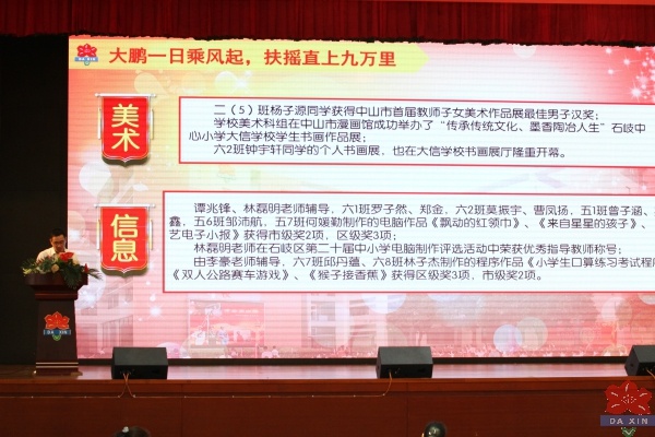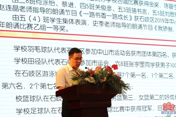首先,馮冠祥副校長代表學(xué)校做了熱情洋溢的總結(jié)性發(fā)言,大鵬一日乘風(fēng)起,扶搖直上九萬里!馮校長肯定了老師們的辛勤付出,贊揚(yáng)了同學(xué)們本學(xué)期所取得的各項成績。德育工作方面學(xué)校少先隊被評為中山市少年紅旗大隊;趙連晶老師被評為中山市優(yōu)秀輔導(dǎo)員;崔子傲、何梓瑜、黃景逸、邱丹蘊(yùn)等榮獲市級好少年;鐘雪殷、郭文月、鄭靜純、駱書言等四人榮獲省級作文優(yōu)秀獎,黎桂芳、辛莉、林晶晶、何婷婷等榮獲優(yōu)秀指導(dǎo)老師獎;王冠、湯嘉琪、王惠等均或石岐區(qū)、中山市比賽一等獎;雷柏謙的父親雷毅豐榮獲“石岐好家長”稱號。教育教學(xué)也喜獲豐收。馮冠祥、趙連晶、遲瑩瑩、杜少君、劉陽、寇璐、鄭凱莉等老師均榮獲區(qū)、市論文、課題一等獎。體育、智育等各項比賽都取得了優(yōu)異的成績,獎狀、獎杯、獎牌不勝枚舉。