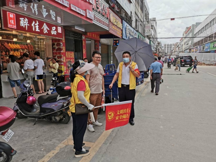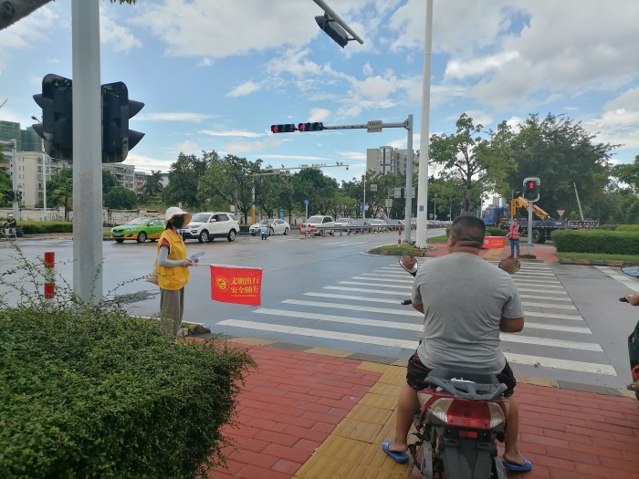 勸導文明出行,幸福安全你我他。孫文東路麗港城與尚城處紅綠燈處車流量大,人口密集。三小的交通勸導小組的教師志愿者每天在此配合交警部門對亂闖紅燈、車窗拋物、違規(guī)駕駛等不文明行為進行文明勸導。夏天天氣多變,他們穿著志愿者馬甲,手拿“文明勸導”旗幟,有時頂著烈日,有時被淋成落湯雞,從不缺崗。此外,交通勸導小組每天還安排10名教師志愿者深入濠頭大街開展文明城市勸導活動,引導社區(qū)車輛規(guī)范停放并向來往行人和車輛宣講道路安全知識,提醒文明規(guī)范停車的重要性,邀請他們一起為創(chuàng)建文明城市貢獻一份力量,共同營造有序文明環(huán)境。天氣炎熱,不少老師嗓子冒煙,多喝水又擔心上廁所問題難解決,只能在中午休息時才大量補水,不少出現(xiàn)了惡心反胃的感覺。但是他們毫無怨言,休息一天后再次申請上崗。