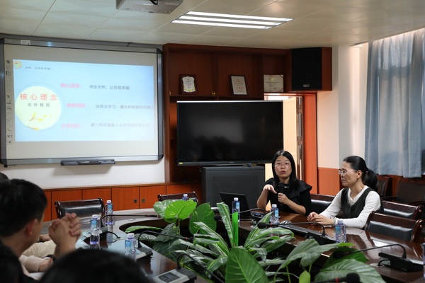 參觀結(jié)束后,老師們來到學(xué)校四樓會議室,首先聽取了該校副校長陳肖影題為《關(guān)懷,從這里起步》的報告,陳副校長從“偉人故里,博愛文化——關(guān)懷從這里啟航”“政策支持,專業(yè)指導(dǎo)——為關(guān)懷保駕護航”“學(xué)校重視,提供支撐——為關(guān)懷注入力量”“課題引領(lǐng),專業(yè)成長——關(guān)懷將揚帆遠航”四方面展開詳細介紹。隨后,王綺老師以《融關(guān)懷理念,育幸福少年》為主題進行分享,她結(jié)合個案,從特殊學(xué)生的診斷、資源教室的使用和特教的初步成效三方面進行交流。王老師耐心細致、娓娓道來,她指出,融合教育是用愛、用心、用情、用時、用智的一份工作,工作雖辛苦、棘手,但十分有意義。