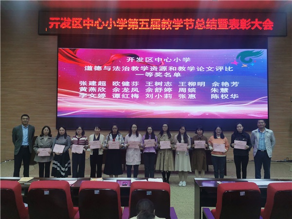 活動伊始,教導(dǎo)處主任劉愛紅從“三個感謝、兩條主線、一個目標(biāo)”三個模塊共五個方面對本屆教學(xué)節(jié)進(jìn)行了全方位的回顧與總結(jié)。劉主任滿懷激情地對在本屆教學(xué)節(jié)期間踴躍報名參賽的教師給予了中肯的贊譽(yù),極大地鼓舞了現(xiàn)場在座老師。隨后舉行了隆重的頒獎儀式。劉剛毅校長、楊異偉副校長分別為在道德與法治教學(xué)資源和教學(xué)論文獲得一等獎的教師頒發(fā)獎狀并合影留念。