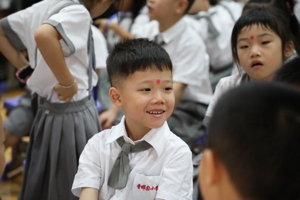 “入學拜老師”是中國傳統(tǒng)私塾教育入學的禮教行為,入學前,學童要拜孔圣人、拜老師,以示尊師重道,從小培養(yǎng)其良好的行為習慣和道德品質(zhì)。香暉園小學秉承先志,發(fā)揚傳統(tǒng),舉行莊重的拜師儀式。全體學生在王主任的指導下,共同起立,齊誦三字經(jīng),向先賢學習。接著雙掌緊扣,彎腰鞠躬,向孔夫子行禮,追思先賢,立志做一個德才兼?zhèn)涞膬?yōu)秀學生。一年級全體教師在臺上接受孩子們的拜師禮。一敬老師,教我做人;二敬老師,教我讀書;三敬老師,不忘師恩。拜師結束后,老師為每個孩子點上“朱砂點”, 寓意讓孩子們用好眼睛和耳朵,專心致志,從此成為眼明、心明、好讀書的聰明學子。