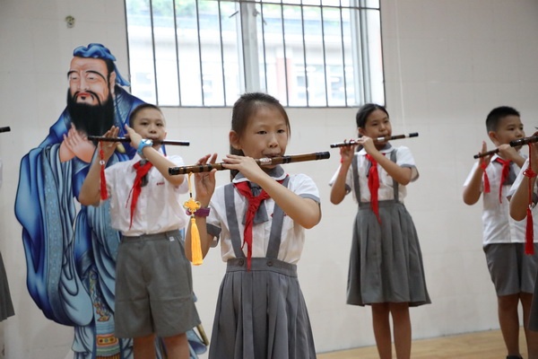 隨后,學校竹笛社團為新生和家長們獻上熱情的《萬馬奔騰》,五(6)班同學則為學弟學妹們帶來經(jīng)典誦讀《千字文》。悠揚熱情的笛聲、鏗鏘有力的讀書聲,聲聲入耳,博得在座學生和家長陣陣掌聲,充分展示了學?!瓣P懷教育”理念下藝術特色教育的成果。六年級6班的張珂同學以大學姐的身份,以學生的視角,聲情并茂地從校園環(huán)境、學校作息、課程設置、教師特點等全方位、多角度向一年級弟弟妹妹們作了詳細介紹,一年級新生們目不轉(zhuǎn)睛,聽得津津有味,眼里充滿了對新的學習生活的憧憬和期待。