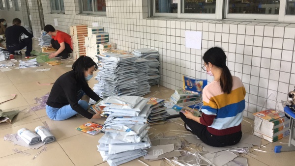 在這特殊時期,為了讓孩子們有書可讀,又避免聚集的風(fēng)險。該校后勤部門確定使用“零接觸”的郵寄方式把新學(xué)期的課本送到每一位學(xué)生手中。迅速組織班主任做好每一位學(xué)生的信息登記、統(tǒng)計,反復(fù)核對確保信息無誤。信息收集完畢后,幾位教師主動承擔(dān)到校協(xié)助郵政人員按年級、班級、人員對書本進(jìn)行打包處理的任務(wù),以最快的速度確保學(xué)生的學(xué)習(xí)用書的到位。