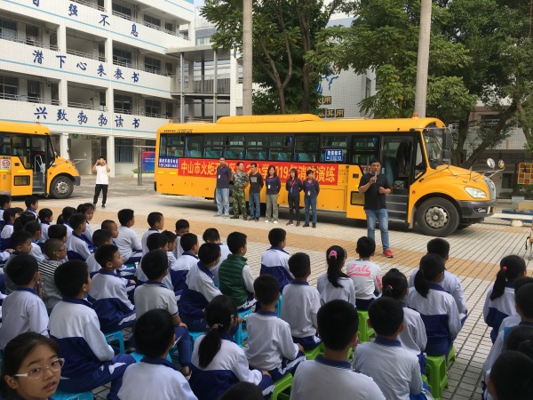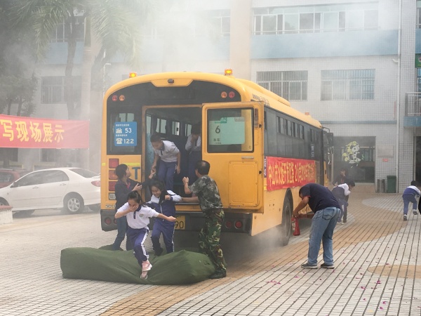 最后的模擬安全逃生是最精彩的,假設(shè)校車在行駛中突然著火了,濃煙滾滾,形勢非常危急,司機(jī)立即將車輛停穩(wěn)并發(fā)布逃生指令,與此同時(shí)校車跟車員臨危不亂,馬上發(fā)出“緊急情況有序撤離”信號,同學(xué)們快速有序地從距離自己最近的前后車門及時(shí)有序撤離到距離校車50米外的安全區(qū)域集合,跟車員隨后及時(shí)清點(diǎn)學(xué)生人數(shù),并報(bào)警救援。短短一分半鐘,車內(nèi)所有學(xué)生已安全逃生,整個(gè)逃生過程緊張高效。