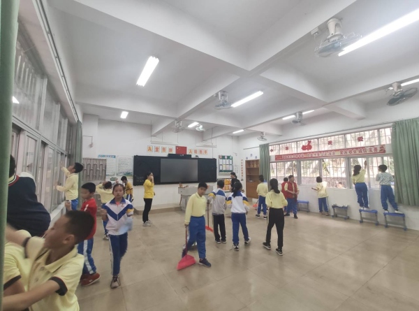 活動(dòng)中,同學(xué)們在老師的指導(dǎo)下,全面打掃教室各個(gè)角落,清理地面上的污漬,掃除教室墻面上小紙片和雜物,清除整理圖書角、講臺上的粉塵雜物,擦洗黑板、玻璃窗臺和墻腳的污漬。校園的每個(gè)角落都能看到同學(xué)們勞動(dòng)的身影,到處都是熱火朝天的勞動(dòng)景象。