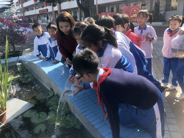 活動伊始,由少先隊輔導(dǎo)員阮結(jié)連老師向參加活動的師生代表講解了“班魚”入池活動的意義,并以現(xiàn)場提問互動的方式與學(xué)生交流。各班級學(xué)生向大家介紹了本班“班魚”的名字和品種。隨后,德育處阮雪屏主任宣布“班魚”入池儀式正式開始,各班級有序地向校園主體景觀“海闊憑魚躍”放入“班魚”?!皹窐贰薄ⅰ皩W(xué)學(xué)”、“四喜”等25條“班魚”正式成為五小的一份子,穿梭在清澈的池水里,一會休憩,一會玩耍,構(gòu)成了一幅生機勃勃的畫面。最后,五小德育處阮雪屏主任結(jié)合學(xué)校新建成的主題景觀對學(xué)生進行“愛校愛班愛生”教育,并建議各班級成立“班魚”守護小組,把學(xué)生高度關(guān)注的素材作為德育的契機。
