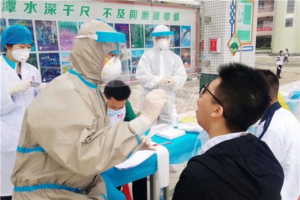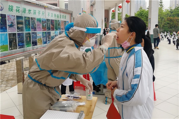 火炬區(qū)一中將自主文化廣場(chǎng)定為檢測(cè)場(chǎng)地,確保通風(fēng)良好。受測(cè)學(xué)生從學(xué)校南門進(jìn)入廣場(chǎng),所有學(xué)生、工作人員進(jìn)校前需做體溫篩查和查驗(yàn)粵康碼,無粵康碼、非綠碼人員及體溫異常不可入校。檢測(cè)時(shí)要出示身份證或?qū)W生證(學(xué)籍號(hào)),需戴口罩。學(xué)校安排全程錄像。現(xiàn)場(chǎng)共分15列縱隊(duì)檢測(cè),至下午4時(shí)左右,市疾控中心的工作人員完成全部檢測(cè)任務(wù)。