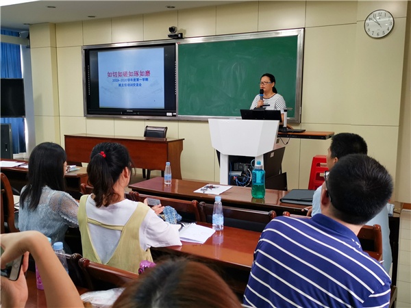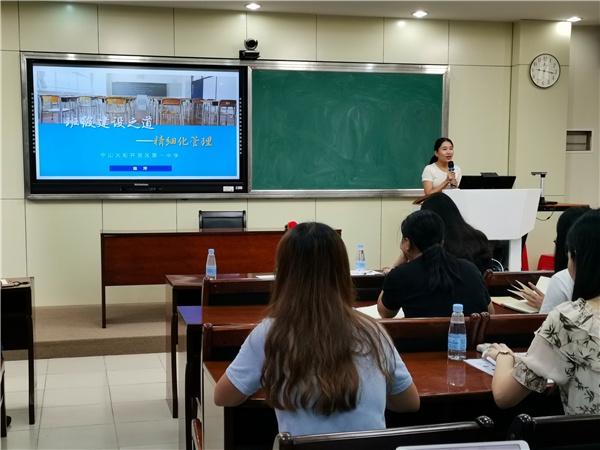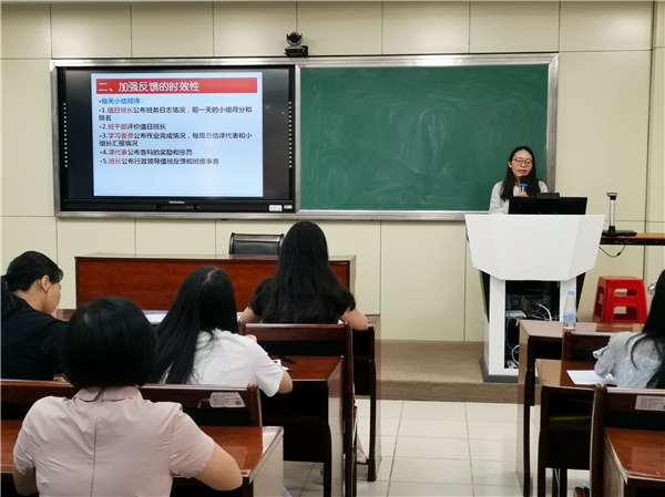 在19位新班主任自我介紹后,培訓會正式開始。首先進行經(jīng)驗分享的是陳萍老師,她以“班級建設之道——精細化管理”為主題,向與會的老師們展示了自己的高效班級管理方法。陳萍老師以“分解、細化、落實”為管理班級的具體思路,把班級的管理劃分為學習、紀律、衛(wèi)生、常規(guī)四部分,通過班級內成立的學習部、紀檢部、統(tǒng)計部、宣傳部、文體部、衛(wèi)生部、人事部進行學生自治。陳萍老師在三年的不懈努力和積極探尋下,不斷培訓學生的自主學習、自主管理、自主評價能力,在初三學年成為了一名輕松、高效的班主任,所帶班級各項成績名列前茅。
