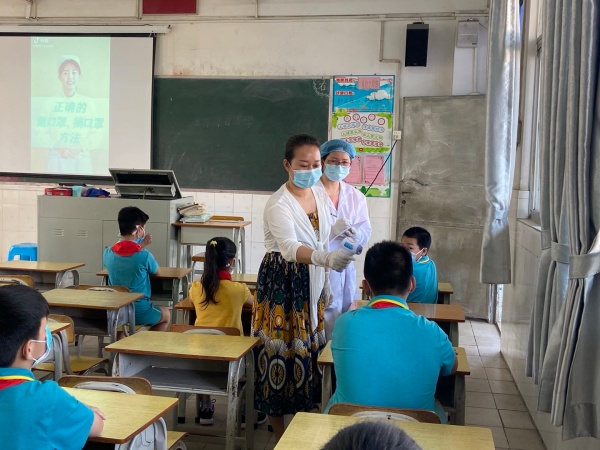 下午3點(diǎn),演練正式開(kāi)始,陸銳勛校長(zhǎng)為本次演練的總指揮;本次演練分為7個(gè)演練內(nèi)容,第一:早上乘校車演練;乘車學(xué)生戴好口罩,學(xué)生之間前后保持1米距離排隊(duì)候車,校車跟車員按順序?yàn)閷W(xué)生測(cè)溫,體溫正常(低于37.3度)才允許乘車。第二:師生進(jìn)校演練;師生佩戴好口罩,有序地排隊(duì),然后依次測(cè)溫進(jìn)校。第三:師生課間管理及體育課演練;下課后,學(xué)生一律在教室內(nèi)各自座位上休息,不能走動(dòng)(上洗手間除外)。上體育課時(shí),學(xué)生帶好口罩,體育老師到班組織學(xué)生按1米距離集隊(duì)和列隊(duì)到運(yùn)動(dòng)場(chǎng)。上課期間,學(xué)生不用戴口罩,一切活動(dòng)要保持一定距離,不能出現(xiàn)聚集。第四:食堂就餐演練;上午放學(xué)后,當(dāng)班老師組織本班學(xué)生排好隊(duì)戴好口罩向食堂出發(fā),原則上按低年級(jí)到高年級(jí)順序安排領(lǐng)餐餐,學(xué)生進(jìn)入飯?zhí)煤?,按指引取餐,取餐后回到各自的教室座位就餐。第五:午間測(cè)溫演練;各班班主任手持測(cè)溫槍,對(duì)學(xué)生逐一學(xué)生測(cè)溫,跟班老師負(fù)責(zé)記錄。第六:下午乘校車演練;學(xué)生戴好口罩,保持距離從各班到飯?zhí)们懊姘锤魅酥付ň幪?hào)站點(diǎn)集隊(duì),集隊(duì)時(shí)不允許交談。集隊(duì)完畢后,由校車管理員、校車值日老師和值班行政帶學(xué)生到校車停泊點(diǎn)上車,學(xué)生在行走過(guò)程要保持1米距離。第七:放學(xué)演練;采取分年級(jí)錯(cuò)時(shí)放學(xué),全校先在班級(jí)進(jìn)行衛(wèi)生安全教育,然后由當(dāng)班老師組織本班學(xué)生戴好口罩,在教室外按照安全距離排好隊(duì)伍,帶領(lǐng)學(xué)生到指定的區(qū)域等候(途中教育學(xué)生保持距離,不能牽手)。最后是消毒演練;每節(jié)課學(xué)生上課后及放學(xué)后,保潔員用噴壺或噴霧器開(kāi)展對(duì)學(xué)校的樓道、走廊、護(hù)欄、洗手間進(jìn)行消毒。