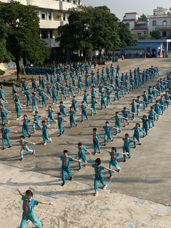 校運(yùn)會的首個項目是廣播體操“七彩陽光”比賽。各班伴隨著激進(jìn)昂揚(yáng)的口令, 24個班的學(xué)生分六個年級組整齊地向大家展示自己的風(fēng)采。他們個個昂首闊步,臉上洋溢著自信的笑容,向大家展示出新世紀(jì)小學(xué)生的靚麗風(fēng)采。