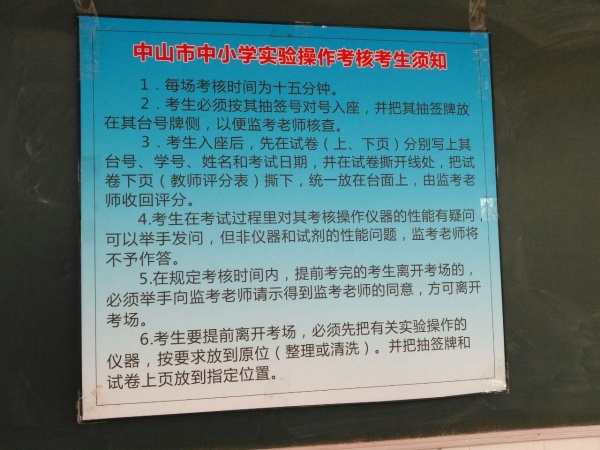 學(xué)校嚴(yán)格按照《中山市教育和體育局關(guān)于調(diào)整2020年初中化學(xué)生物和小學(xué)科學(xué)實(shí)驗(yàn)操作考核工作的通知》(中教體通〔2020〕39號)的要求和疫情防控工作的需要,結(jié)合民眾鎮(zhèn)教育事務(wù)指導(dǎo)中心的工作要求,切實(shí)做好2019-2020學(xué)年生物的實(shí)驗(yàn)操作考核工作,學(xué)校教導(dǎo)處和生物教研組充分結(jié)合本校實(shí)際與學(xué)生學(xué)情,共同制定生物實(shí)驗(yàn)操作考核方案,并于6月3日開展2020年生物實(shí)驗(yàn)學(xué)生操作考核工作,考核人數(shù)共計(jì)389名學(xué)生。此次生物實(shí)驗(yàn)操作考核在《通知》要求的必做實(shí)驗(yàn)中抽題對學(xué)生進(jìn)行了考核。