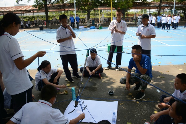 在拓展活動過程中,學(xué)生們進(jìn)行了“團(tuán)隊融冰”、“挑戰(zhàn)NO、1”、“妙筆生花”、“鼓舞飛揚(yáng)”和“動力繩圈”等項目。這些項目活動,不僅要求同學(xué)們要有堅強(qiáng)的意志和不怕苦,不怕累的精神,還要求他們要懂得配合,能夠團(tuán)結(jié)協(xié)助。同學(xué)們在活動過程中,就算體力透支,仍然堅持不放棄,總結(jié)經(jīng)驗,最終勝利完成所有項目,真正體驗到了堅持和團(tuán)結(jié)的快樂。同學(xué)們以智慧的頭腦和高度的團(tuán)結(jié)協(xié)作精神,圓滿地完成了一個個挑戰(zhàn)的項目。