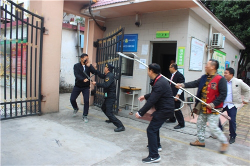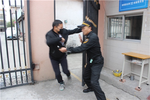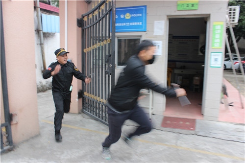 隨后現(xiàn)場(chǎng)模擬事發(fā)場(chǎng)景:一男子(我校老師扮演)戴著黑色口罩在校門(mén)外徘徊,趁學(xué)校開(kāi)門(mén)之時(shí),闖進(jìn)學(xué)校,學(xué)校保安人員馬上前去勸其停下,并讓他離開(kāi)學(xué)校,該男子不聽(tīng)勸告繼續(xù)往校內(nèi)闖,保安前去制止,該男子突然拔出“兇器”——鐵錘,砸向保安,保安及校安處負(fù)責(zé)人員迅速啟動(dòng)反恐防暴應(yīng)急處置預(yù)案,指揮工作小組人員在最快的時(shí)間內(nèi)到位,按照分工與職責(zé)處理突發(fā)事件,制服犯罪青年,把師生受傷害程度控制在最低限度。