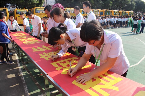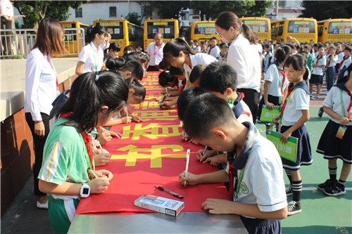 隨后,劉品江副校長帶領(lǐng)全體教師在“書香潤童年 閱讀伴成長”橫幅上簽名,各班班主任帶領(lǐng)學(xué)生代表在橫幅上簽名。老師和同學(xué)們簽下的不僅僅是自己的名字,更是一份承諾,一份認(rèn)真讀書的決心。