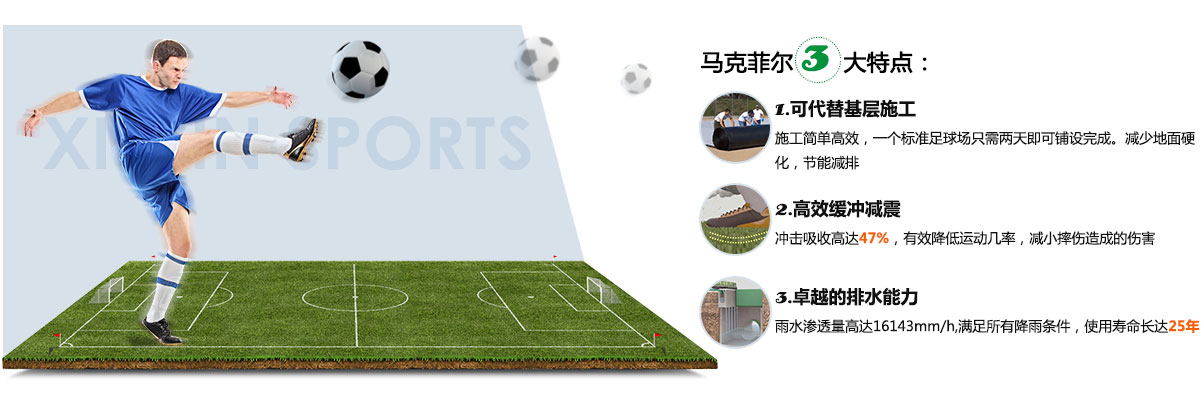 馬克菲爾足球場多功能基層墊是一款專用于人造草足球場的基礎(chǔ)墊層,以其卓越的性能和創(chuàng)新的系統(tǒng)設(shè)計滿足最高端的場地要求。是一款徹底顛覆傳統(tǒng)足球場基礎(chǔ)建造方案的革命性產(chǎn)品。其多功能表現(xiàn)為:可替代水泥和瀝青基礎(chǔ),高效緩沖減震以及卓越的排水能力和球場穩(wěn)定性。