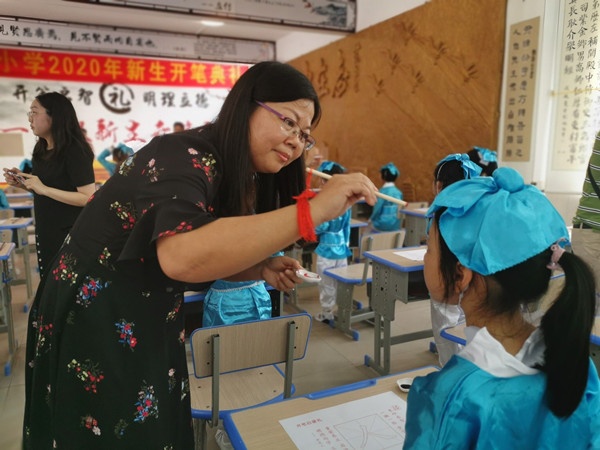 吳校長帶領(lǐng)著學(xué)校老師俯下身依次在每一個孩子的額頭正中央點一顆紅痣?!梆搿蓖ā爸恰?,意為開啟智慧,蘊(yùn)含著對新生們的美好期許。艷麗的朱砂不僅點新生的額頭上,更深深地印在了他們的心中。學(xué)校還邀請已退休教師董印生回校,為新生們擊鼓三聲,寓意深刻。
